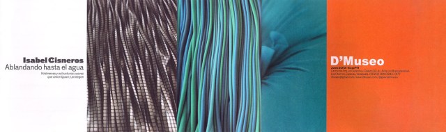 En el caso de Isabel Cisneros, es la a Galería D’Museo que está ubicada en el Centro de Arte Los Galpones, donde hasta el 14 de julio se presenta su individual Ablandando hasta el agua. En este ejercicio casi inédito en la obra textil venezolana, la artista traslada los esquemas iniciales de estructuras desarrolladas en otros medios, y remoza con acuciosa actualidad aquellos caminos que le otorgaron un lugar representativo dentro de la cerámica contemporánea del país. Ahora, las volumetrías expresivas de la quema se deslizaron hacia las consideraciones visuales del material textil, un riesgo espacial que pronunció las posibilidades de la artista al reavivar sus inquietudes desde otras perspectivas. Desde preocupaciones internas por una ciudad en conflicto, reconstruyó el recorrido sensible de botones, arandelas, gafetes, cierres telas tornasoladas y pliegues. Para Cisneros fue la dureza de los tiempos que vivimos el motivo principal de este ablandamiento, suavidad que surge como testimonio y levedad luego de la tormenta, pericias de una tela que se amplía y se metamorfosea frente a las azoradas demandas de un contexto sórdido y disperso.
