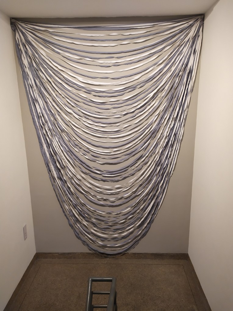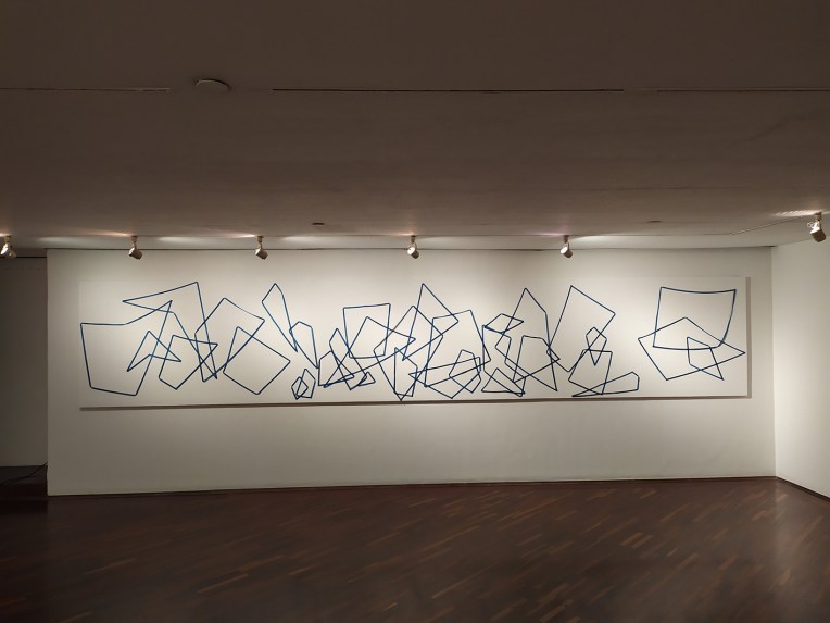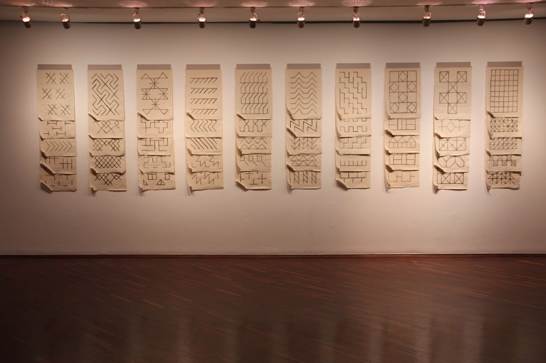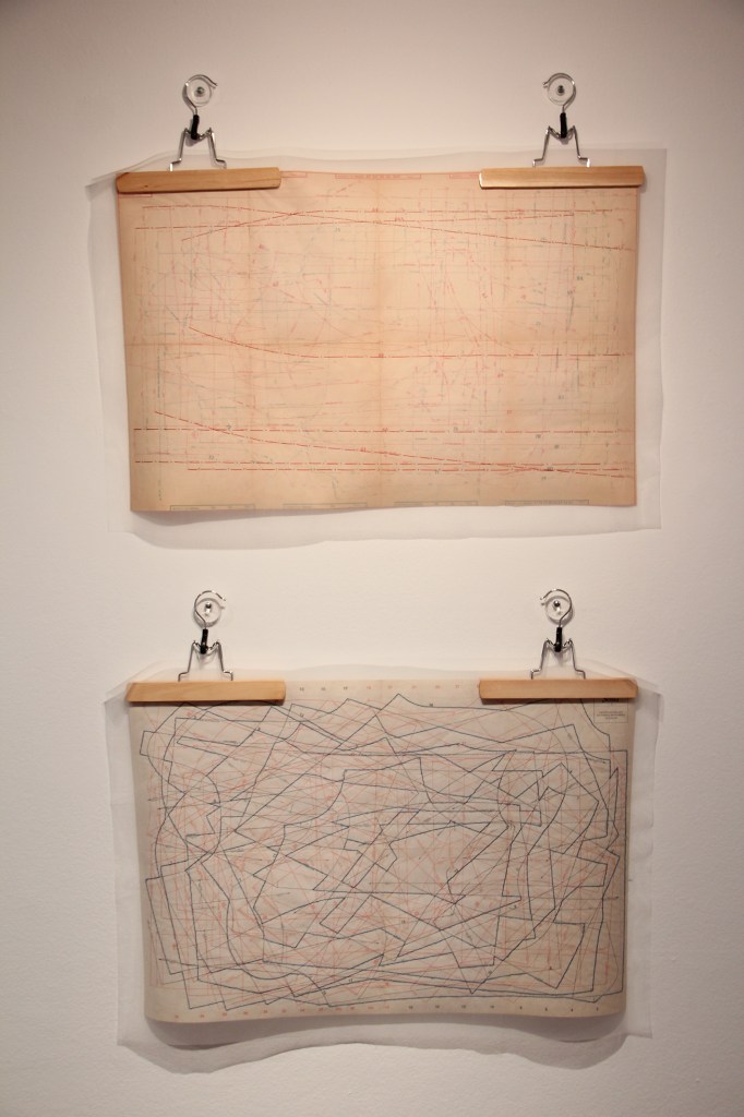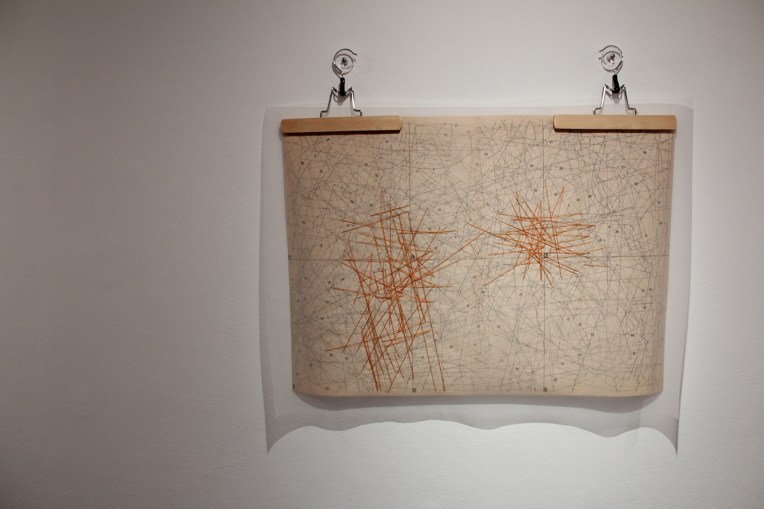 Escribe encima (¿sobre?) lo que ya está escrito, traslación también es traducción y tachadura (porque la voluntad para la que fueron hechos los patrones se deshizo). Las estrías arrancan de la mitad del papel hacia arriba, brotan siguiendo el curso de las decoloraciones del patrón, pero el negro del hilo las vuelve inexpugnables. Del propio fantasma inicial, translúcido que era el soporte con su vahído tatuaje, nos quedan borrones de galimatías. Nos abandona “en la estacada” con un mapa tachado, no topográfico sino temporal, de lo que ya no tiene lugar ni tiempo.