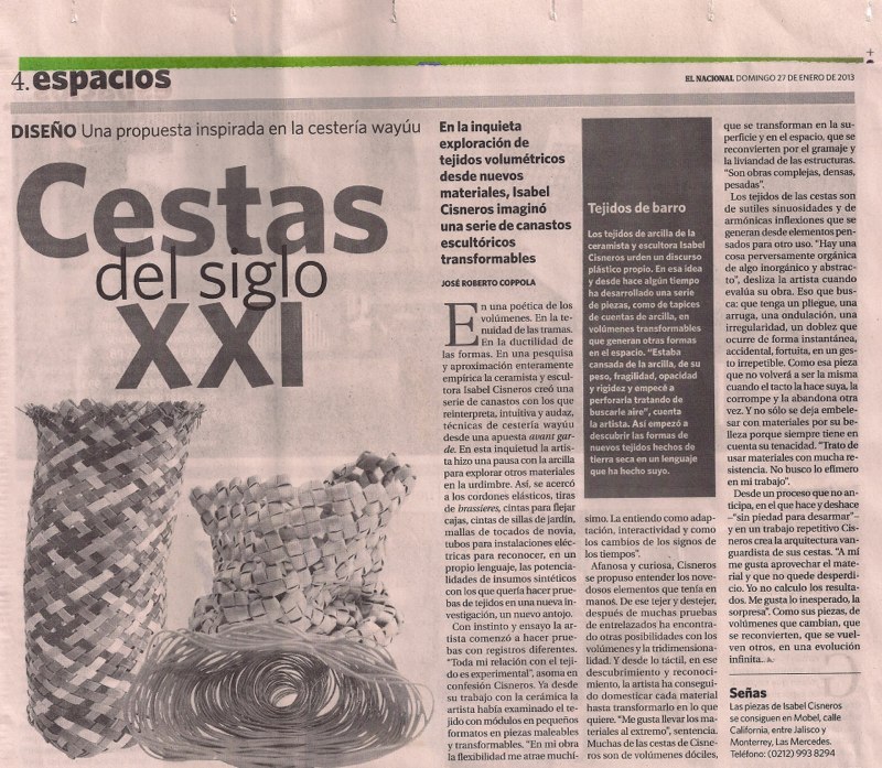 En una poética de los volúmenes. En la tenuidad de las tramas. En la ductilidad de las formas. En una pesquisa y aproximación enteramente empírica la ceramista y escultora Isabel Cisneros creó una serie de canastos con los que reinterpreta, intuitiva y audaz, técnicas de cestería wayúu desde una apuesta avant garde. En esta inquietud la artista hizo una pausa con la arcilla para explorar otros materiales en la urdimbre. Así, se acercó a los cordones elásticos, tiras de brassieres, cintas para flejar cajas, cintas de sillas de jardín, mallas de tocados de novia, tubos para instalaciones eléctricas para reconocer, en un propio lenguaje, las potencialidades de insumos sintéticos con los que quería hacer pruebas de tejidos en una nueva investigación, un nuevo antojo.